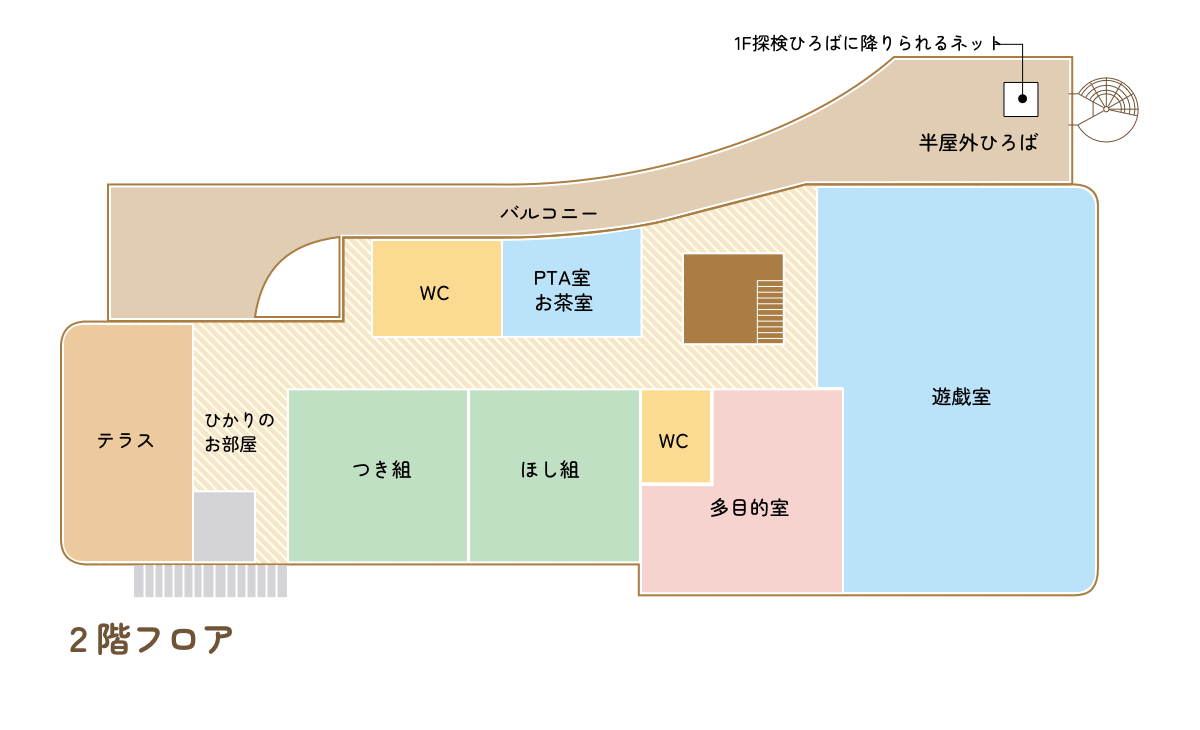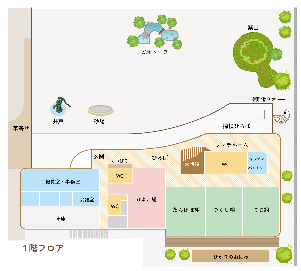 園庭にはビオトープが設けられ、自然の雨でめだか池になり藻が茂り、木のぬくもりを感じ取れるようになっています。
